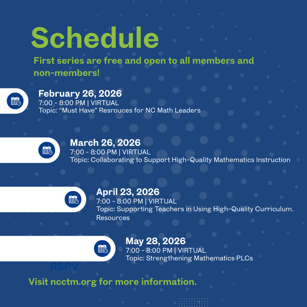 NCCTM’s Leadership Learning Series will meet monthly during the spring to provide space for math education leaders across North Carolina to connect, learn, and collaborate around high-leverage leadership topics.